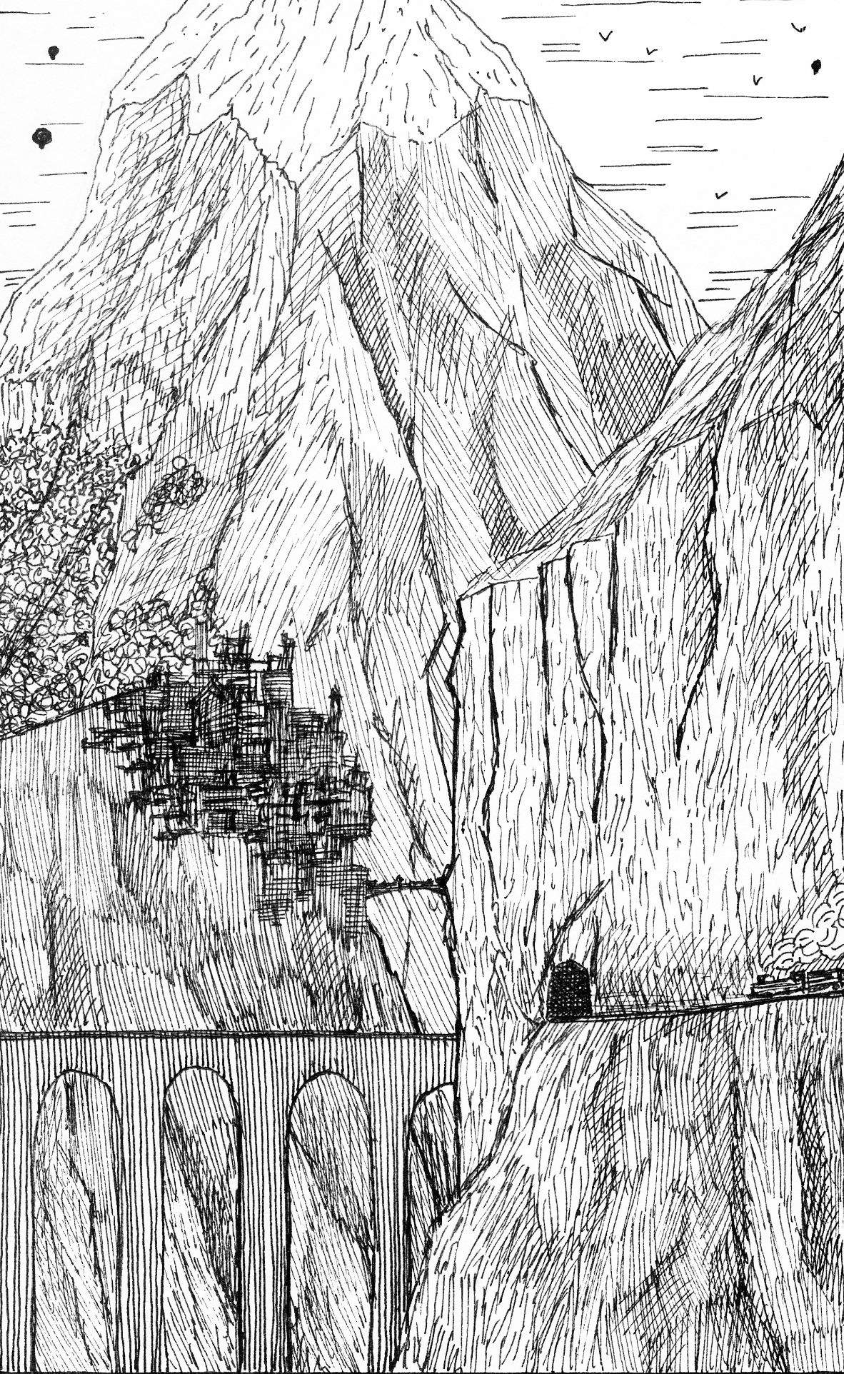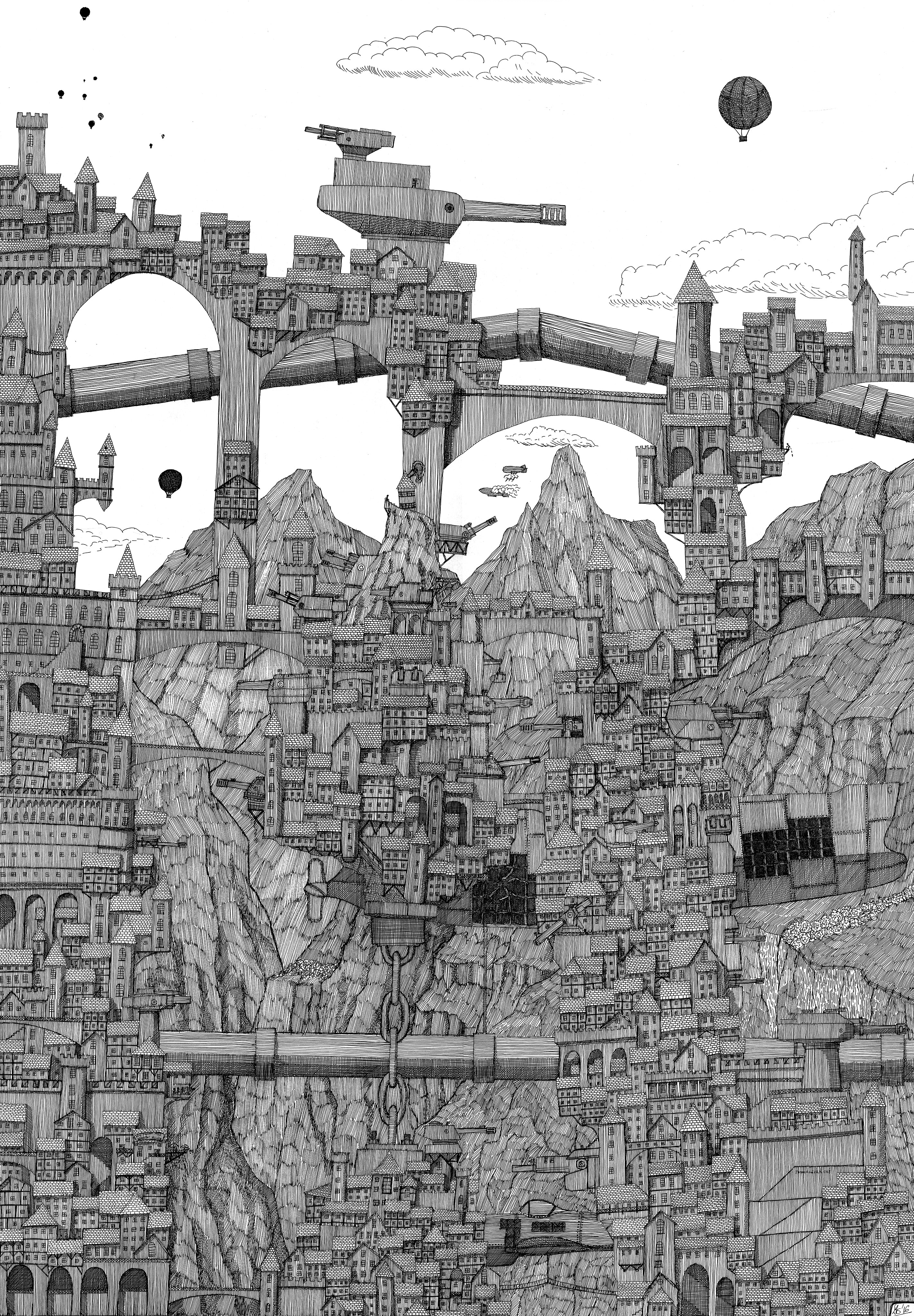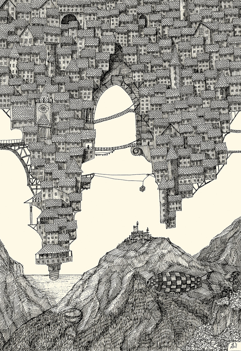 (Italo Calvino Invisible Cities) “…And as I sat admiring the mountains, observing vertiginous towns and their bridges, I contemplated murder on the Etimret Express.” “…The contrast between the hanging slums and the castled rich is seen here most eloquently, the hanging poor high in their poverty, by a matter of distance are prevented from shitting on any but themselves… yes, Tobias? No there’s a surprisingly high mortality rate just from gravity alone…”“And here we see life from the bottom of a semi industrial gully. From the window of The Drunken Harlot, whazzat? No the Airships were looking for me, but as my presence here might imply, they never caught me…”